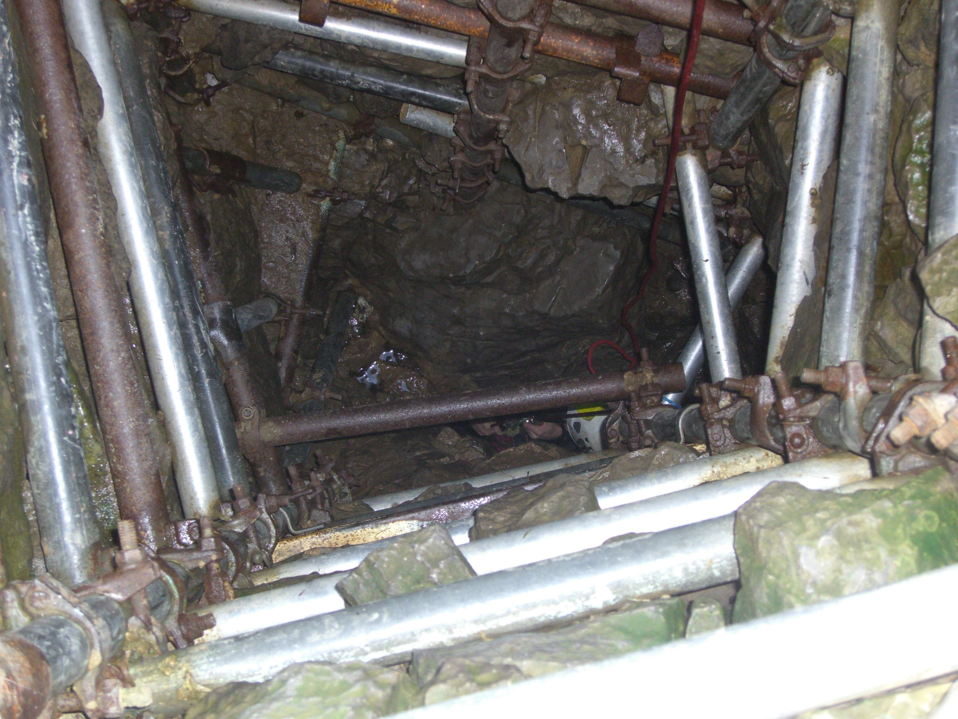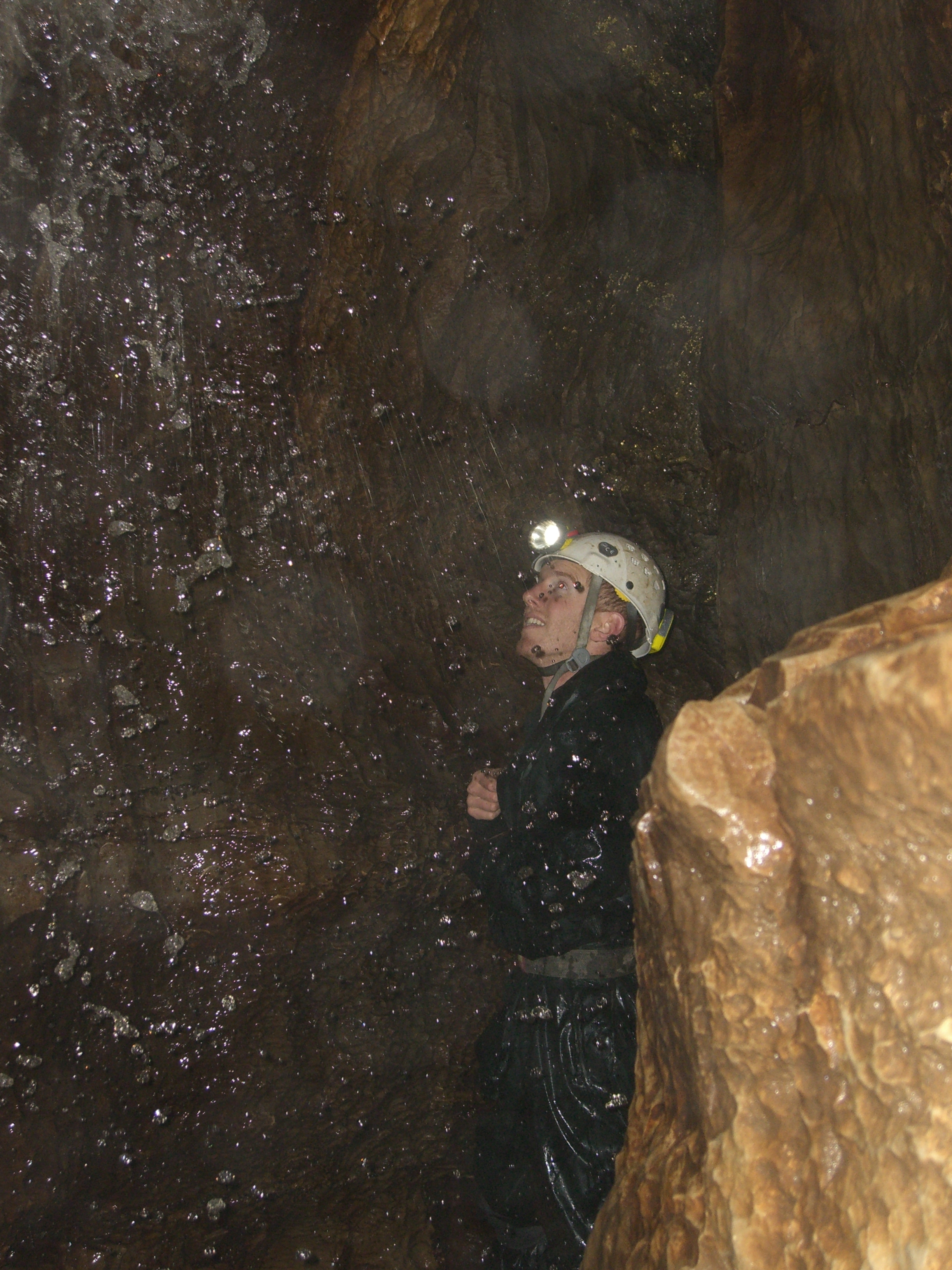 We then returned to the main chamber and investigated downstream. After a quick look at the sump, where Henry refused my suggestion that he should swim in it, Henry had a quick climb up a rope to investigate a dig. “Horrible”, was his verdict, so I believed him and stayed where I was. After squirming through holes and small waterfalls we arrived at a low streamway where a crawl to the right brought us out into a large breakdown chamber. At this point we were struggling to tally the description with what we had just been through and rather than follow some pipes through a low crawl underneath some boulders we climbed up the same boulder slope. After a few minutes of getting muddy we ended up back in the streamway. By now we were running out of time; his girlfriend had an appointment with a bonfire, he said. We decided to leave rather than faff around rushing and looking for the Thin White Line at the end of the cave. The exit was uneventful, surprising myself because I was sure the constriction would cause a certain amount of cursing.